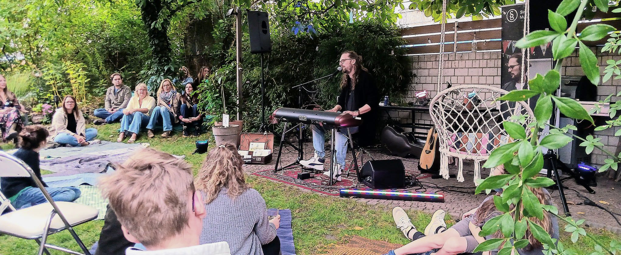 Im wunderschönen Garten der Künstlerin Cat aus Magdeburg durfte ich ihre private Ausstellung musikalisch begleiten. Kinder sprangen umher, die Katze schlich um meine Beine herum und es wurde gesungen und gelacht. Nachbarn kamen vorbei und als es langsam dunkler wurde, leuchteten die Bäume in schönem Licht. Klingt alles ziemlich kitschig, aber… genauso war es!